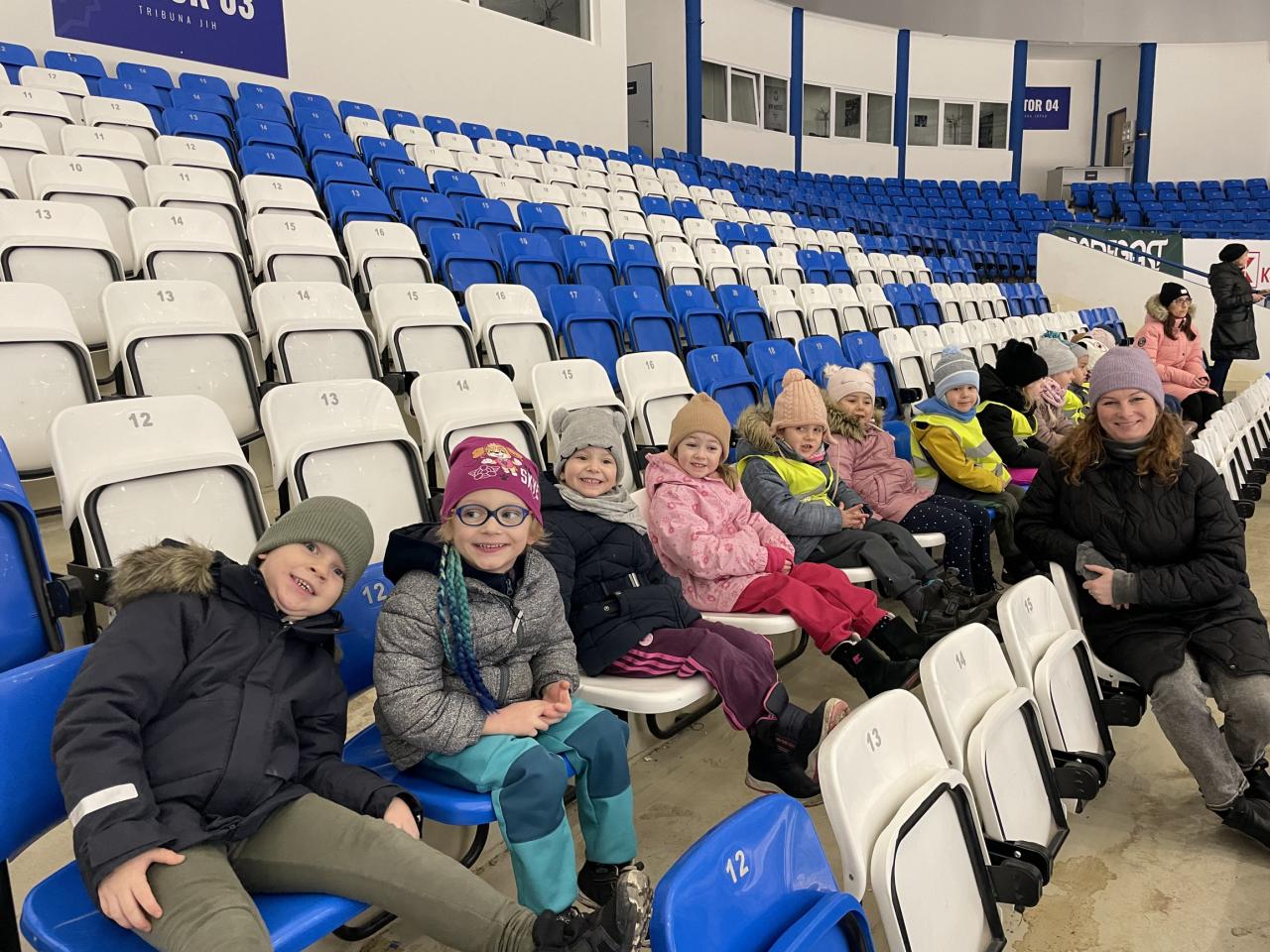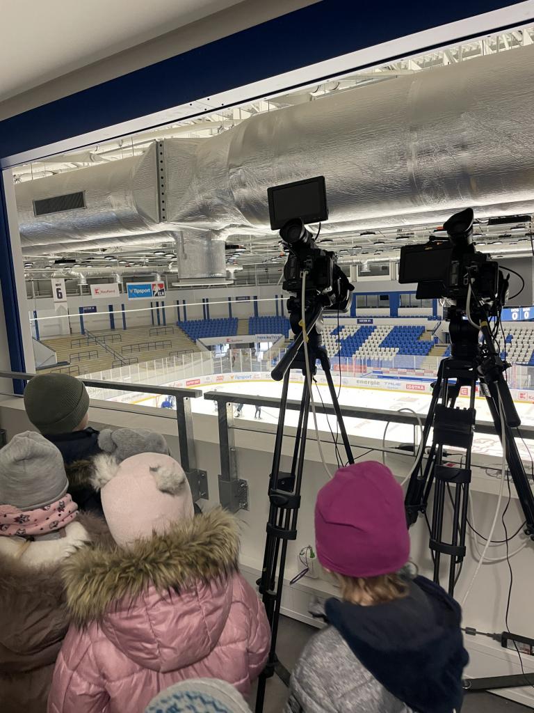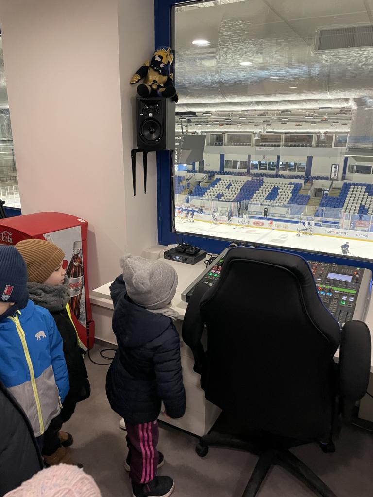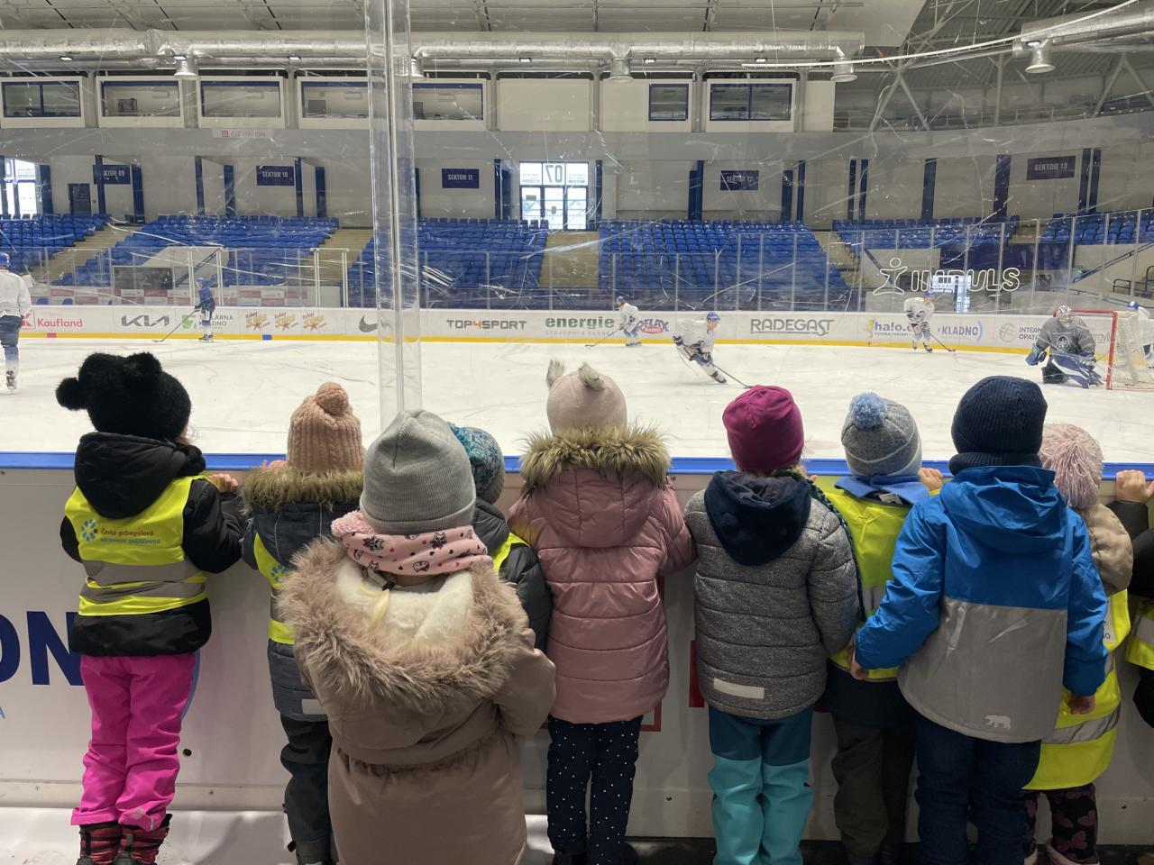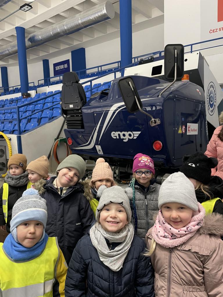 Projeli jsme se městskou dopravou a šli jsme se podívat na zimní stadion, děti si mohly prohlédnout rolbu, zákulisí pro natáčení, ale hlavně trénink našich kladenských hokejových hvězd
