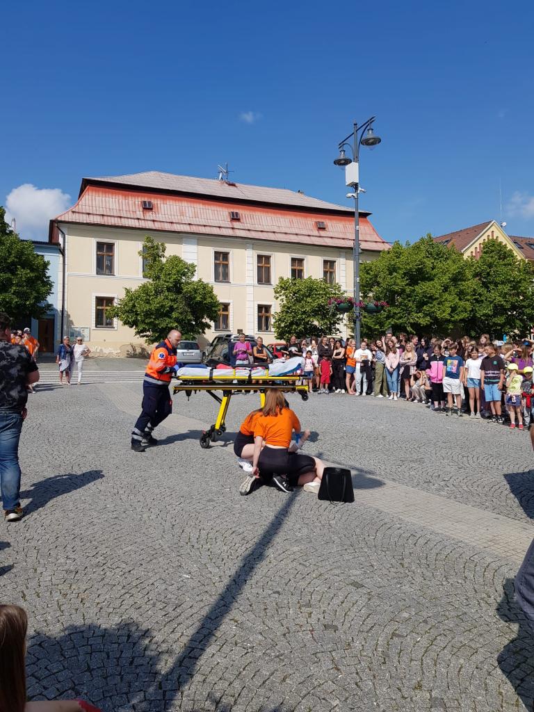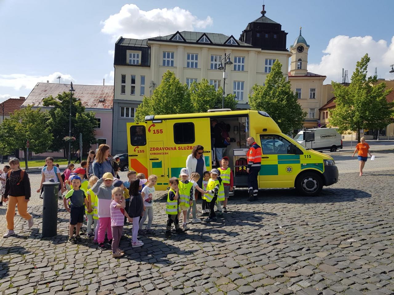 Děti si na náměstí St. Pavla prohlédly sanitku, hasičský a policejní vůz, sledovaly zásah zdravotníků při první pomoci.
