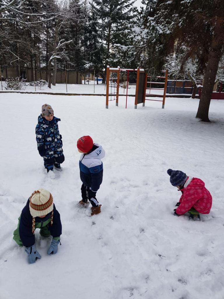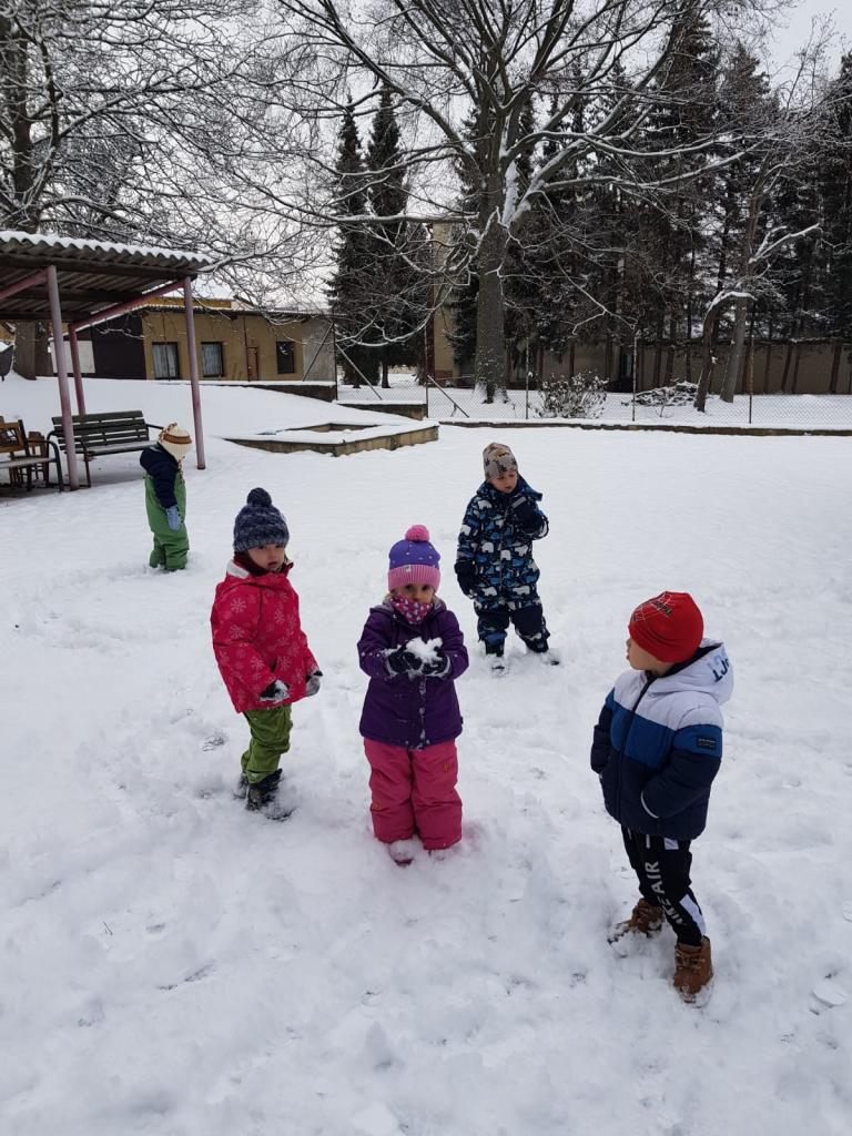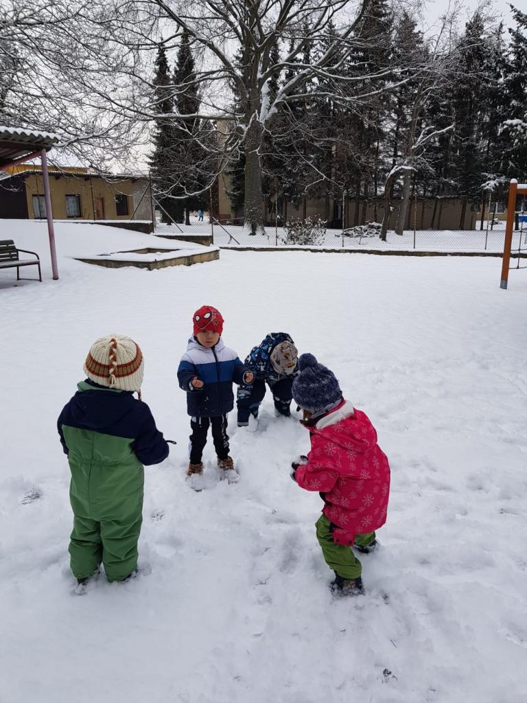 Děti si na školní zahradě užily sněhu, tvořily stopy, koule, koulovani a klouzání.