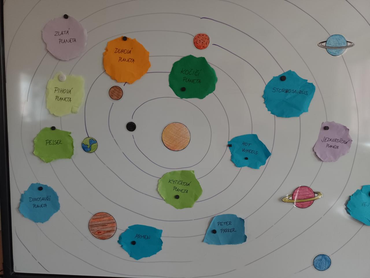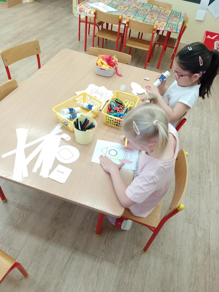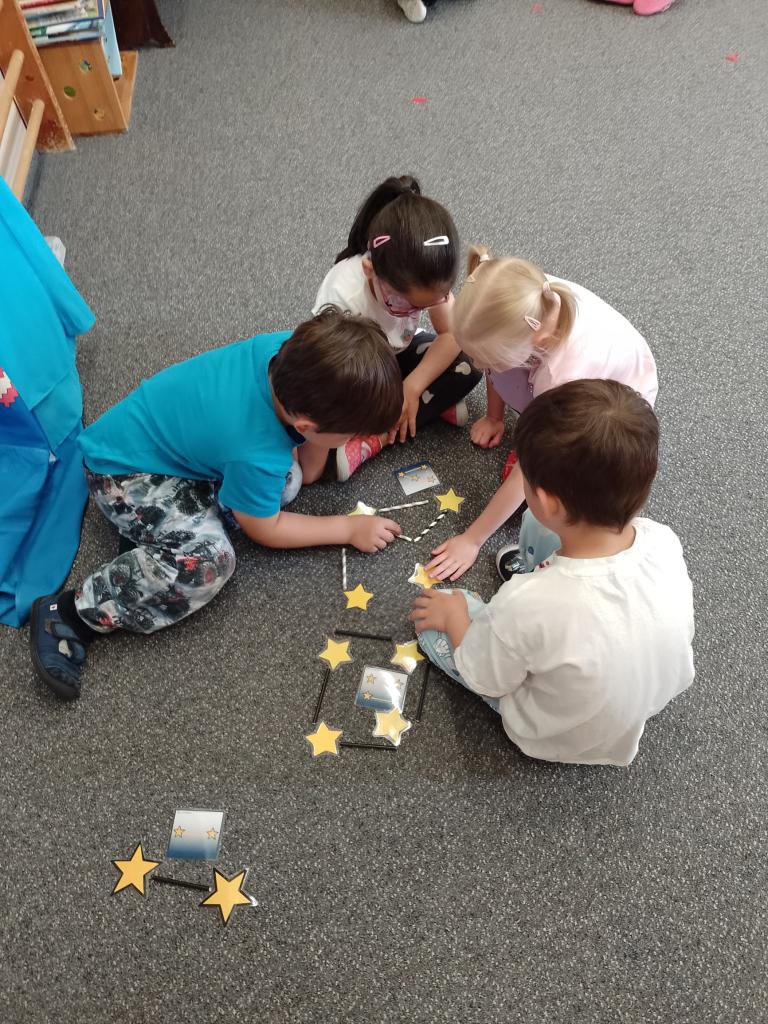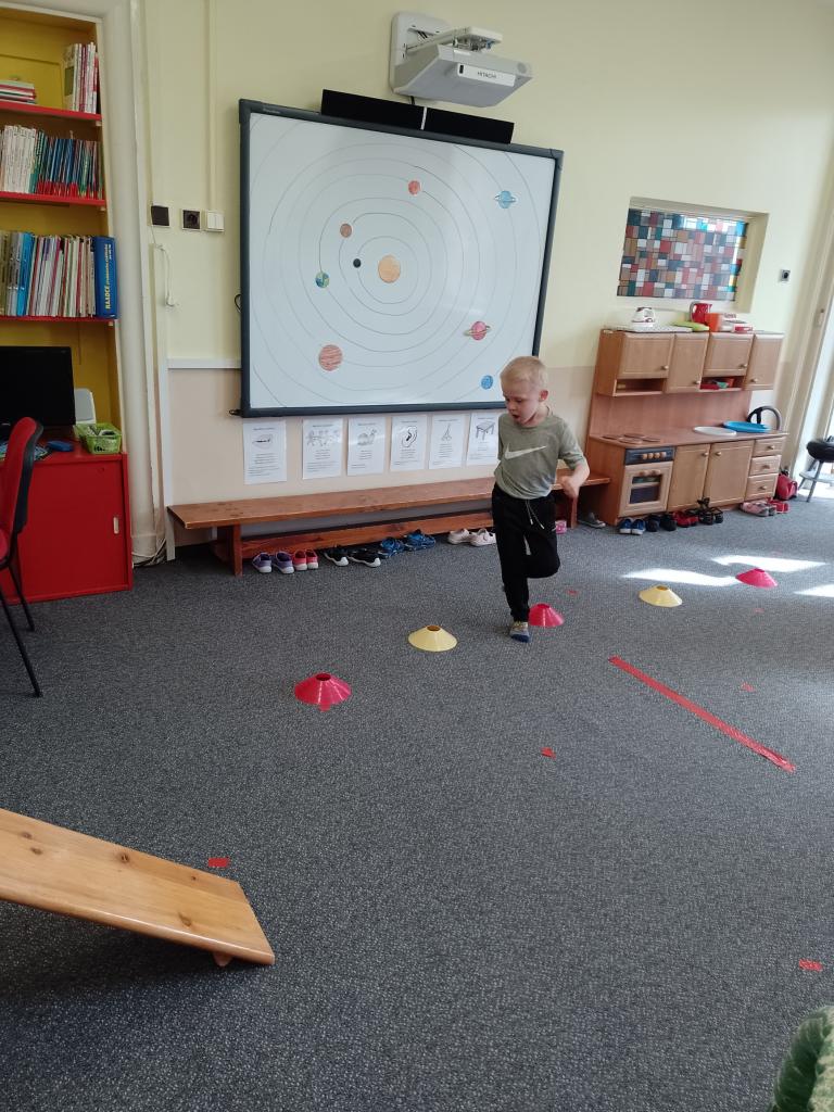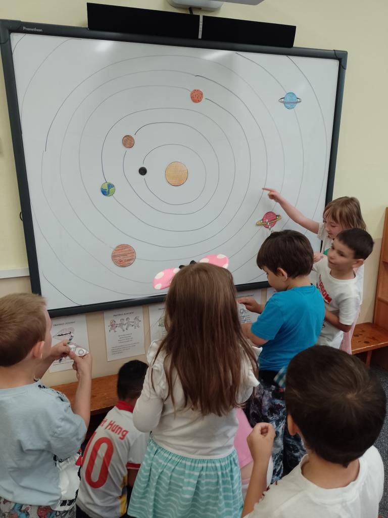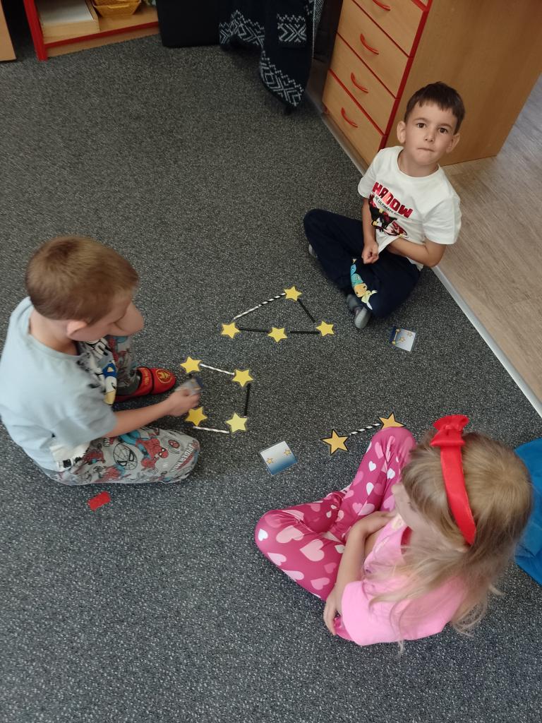 Děti si vyzkoušely přenášení prstence Saturnu, trénovaly dech foukáním do brčka s raketkou, společně skládaly souhvězdí, prohlížely si knihy o vesmíru, zvládly vesmírnou překážkovou dráhu, trénovaly jemnou motoriku - vytrhávaly planety z papíru a dávaly jim jména, přenášely planety pomocí kolíčku. Hráli jsme si na černou díru, vyráběli planetky a kosmonauty a mnoho dalšího...