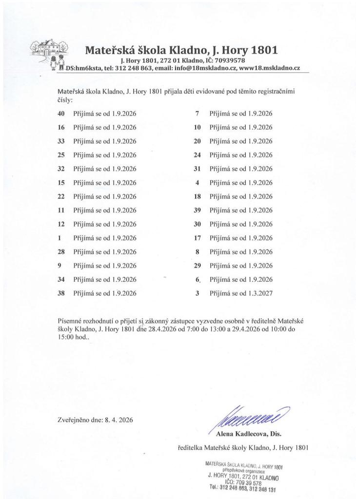 Písemné rozhodnutí o přijetí si zákonný zástupce vyzvedne osobně v ředitelně Mateřské školy Kladno, J. Hory 1801 dne 28.4.2026 od 7:00 do 13:00 a 29.4.2026 od 10:00 do 15:00.