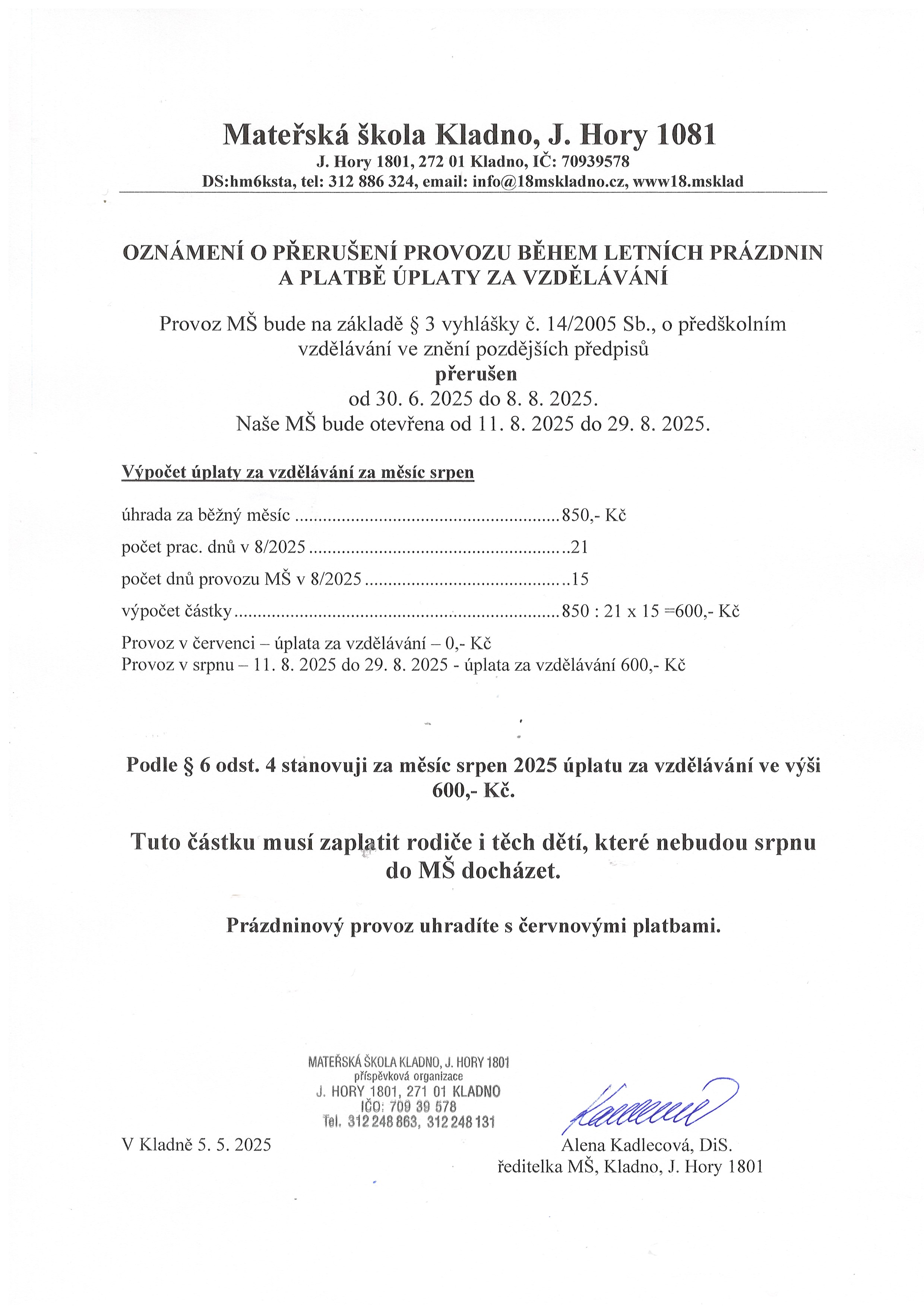 Oznámení o přerušení provozu během letních prázdnin a platbě úplaty za vzdělávání