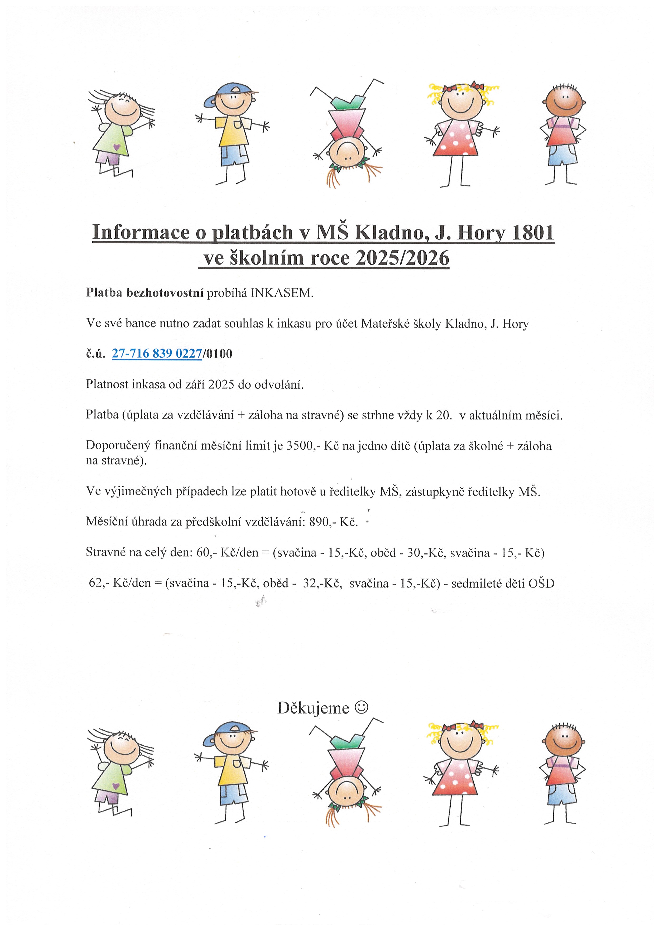 V den nástupu do MŠ nahlašte prosím svým učitelkám způsob platby – inkaso/hotovost